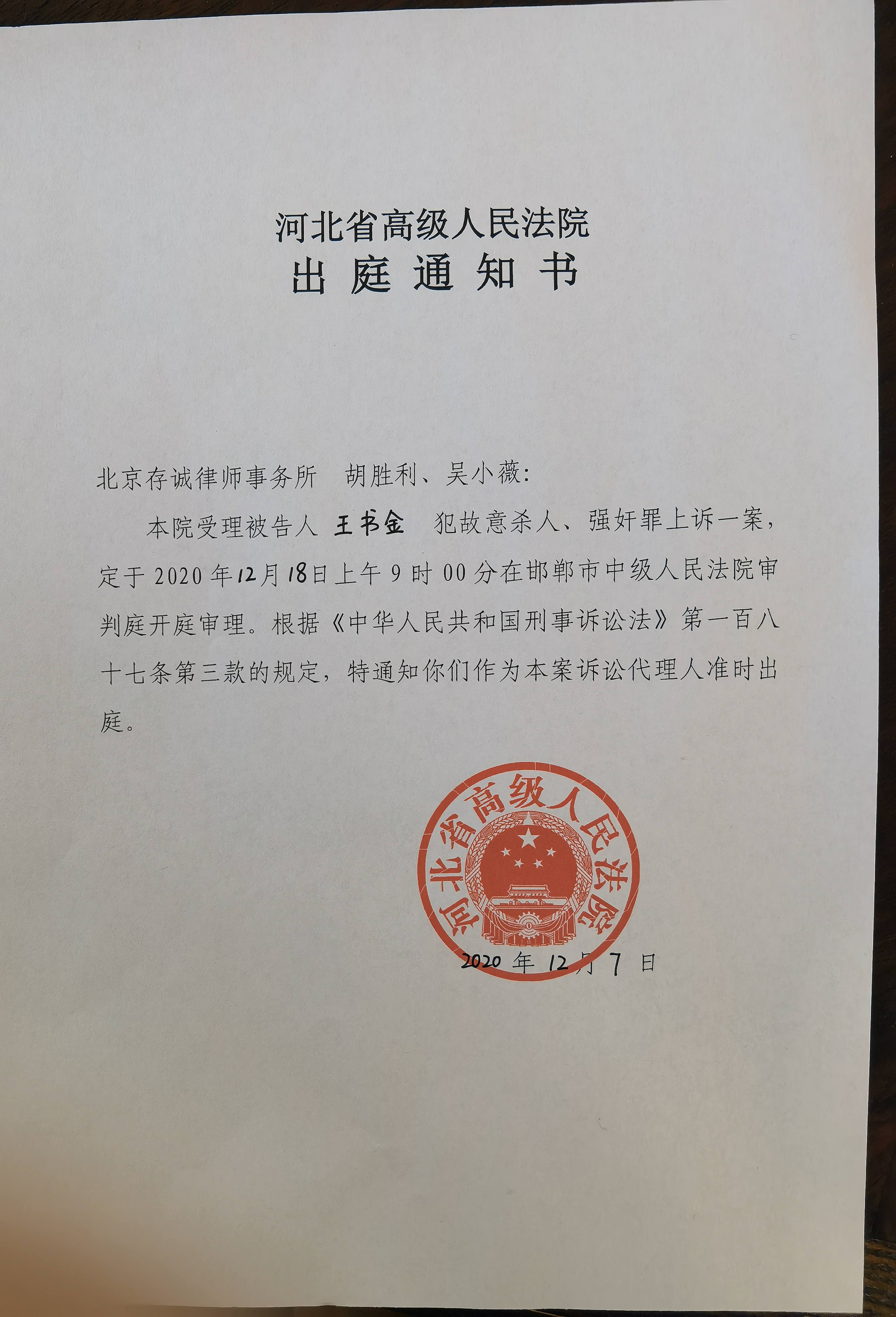 备受关注王书金强奸杀人案迎来新的进展。河北省高级人民法院做出的《出庭通知书》显示,该院受理被告人王书金犯故意杀人、强奸罪上诉一案,定于2020年12月18日上午9时在邯郸市中级人民法院审判庭开庭审理。