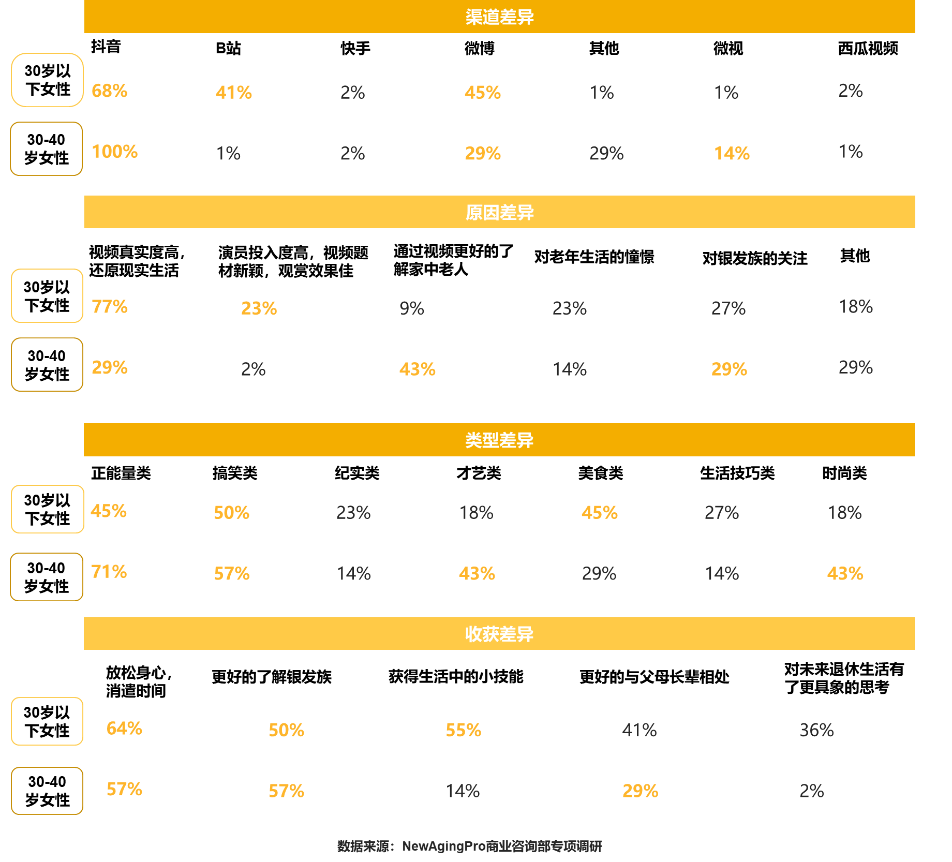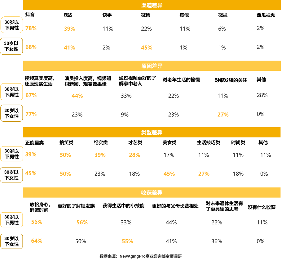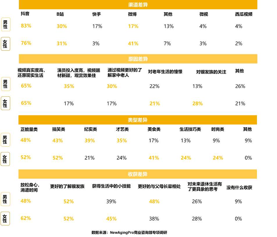 通过对年龄、性别、观看特征等维度的交叉分析,NewAgingPro新老年洞察团队发现它们存在以下差异:
