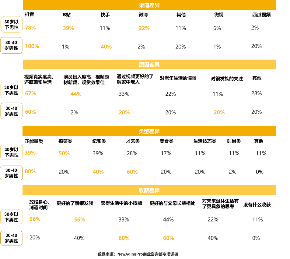 30-40岁男性用户因视频真实度高而开始关注银发题材短视频。同时,他们也希望借此机会更多的了解银发族的生活习惯以及心理特征,从而促进与家中长辈的相处。