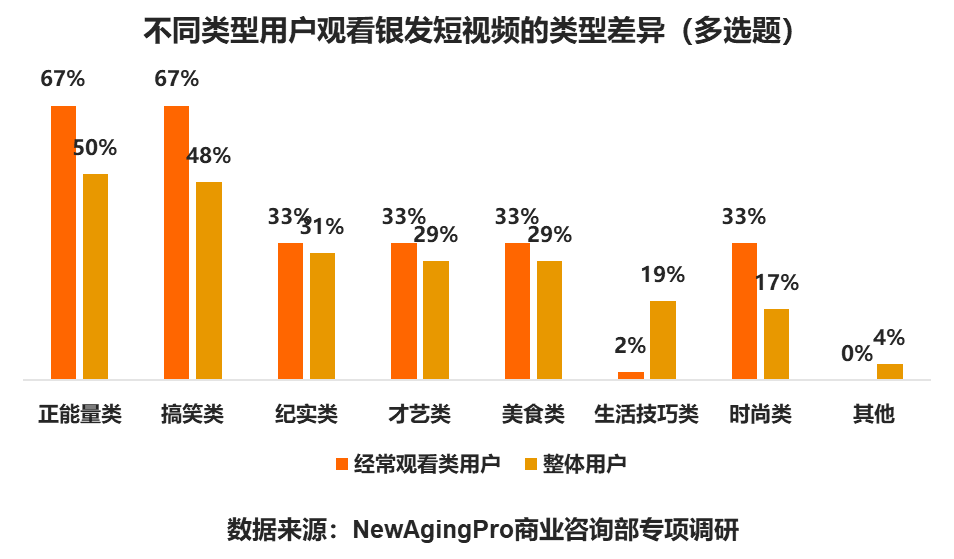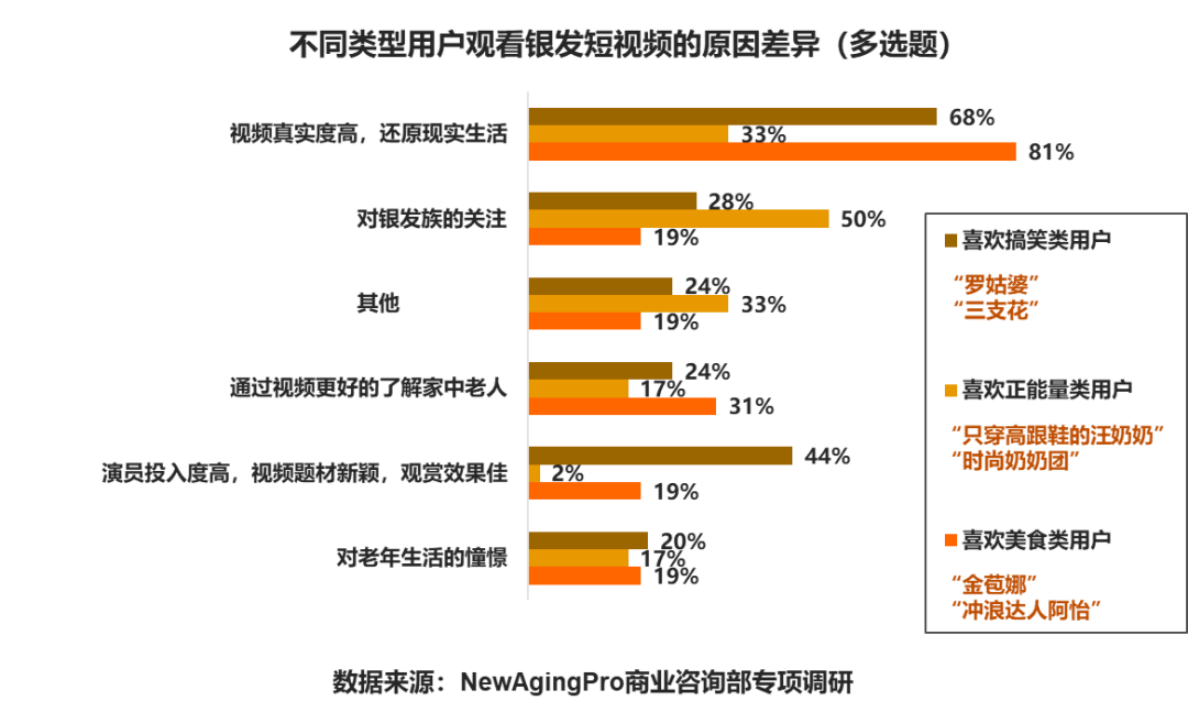我们发现,对于喜欢搞笑类用户来说,他们观看银发短视频的主要原因是银发短视频非常真实且有创意,具有很好的喜剧效果。