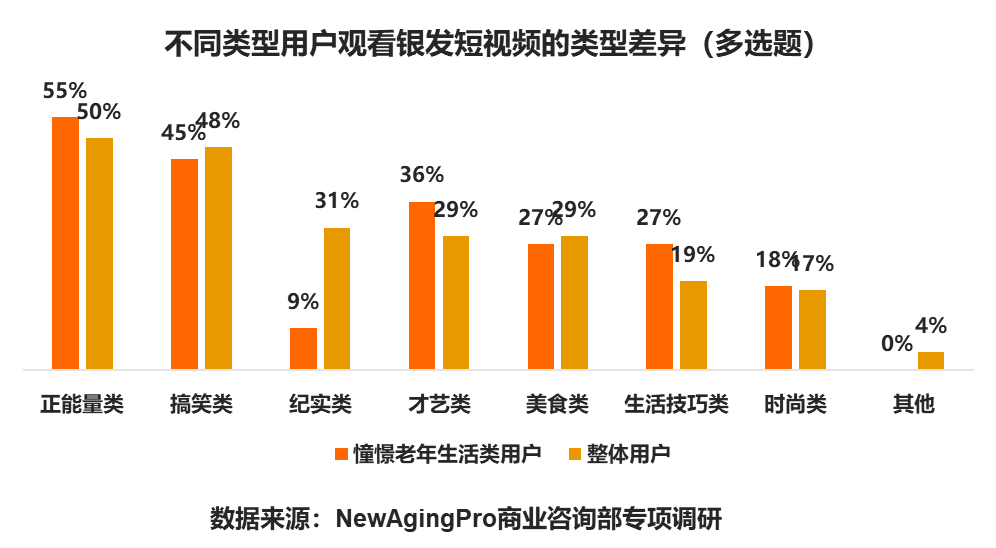 通过对憧憬老年生活类用户和整体用户的对比,我们发现因为憧憬老年生活的这一类用户对正能量类、搞笑类、才艺类有明显的偏好。从这些短视频中,他们对未来的养老生活有了更具象的思考,希望自己以后的生活能够像视频中的银发网红们一样,充满快乐、充满热情、充满正能量。
