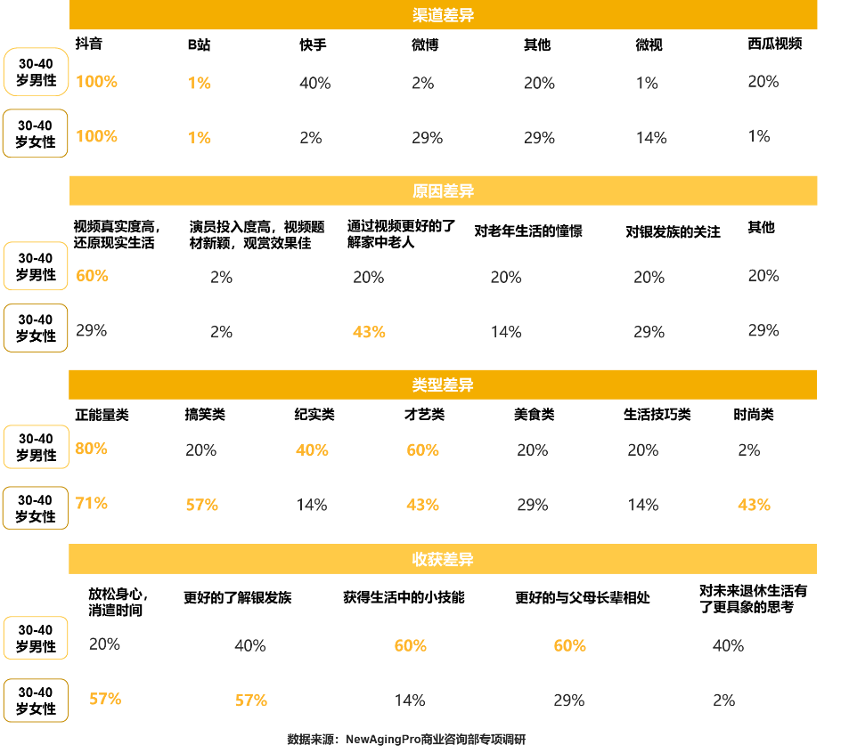 30-40岁女性用户则通过短视频放松了身心、收获了快乐,同时她们也对银发族有了更深入且客观的了解。
