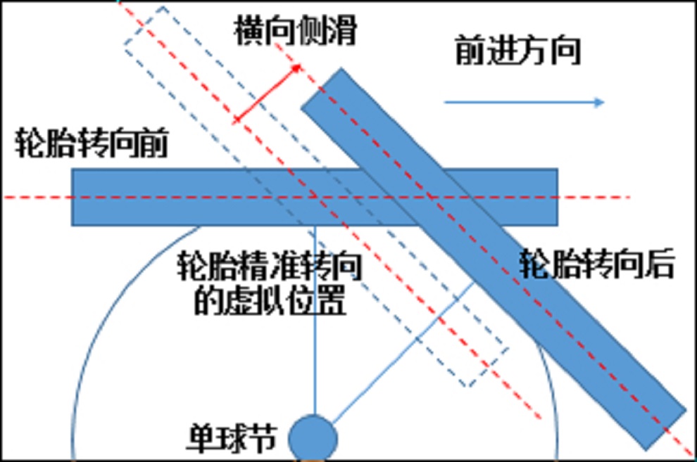 (3)主销中心线偏离轮胎中心线,转向时,轮胎实际上是绕着球节做圆弧运动,转向的同时还伴随横向滑移。轮胎受到与滑移方向相反的摩擦力,外侧车轮外倾角变大,内侧车轮外倾角变小,车辆实际转过的角度小于预期,转向精准度低。