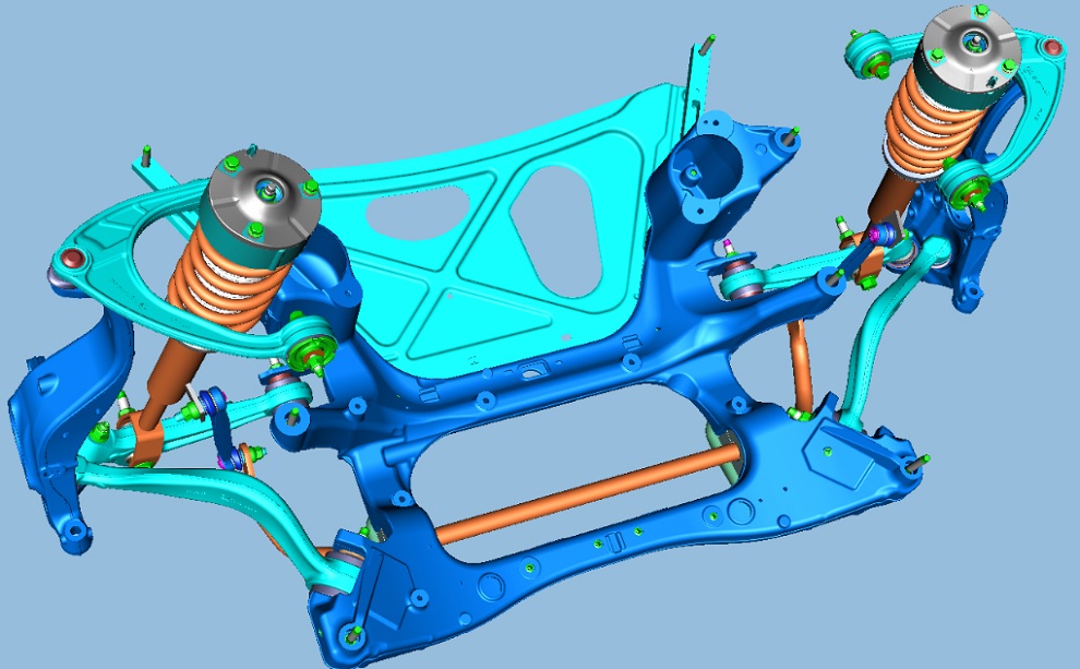 一套双球节双横臂的悬架形式,将多连杆与双横臂结构的融合可谓巧夺天工,同时采用全铝打造的连杆和中空铸铝的副车架又使质量得到了有效控制,而对空间布置的解决方案则可以用另辟蹊径来形容了。