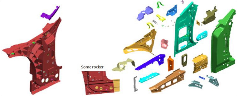 可是如此复杂的悬架形式,如何解决空间布置的问题呢?互联思维下的创新据说是这样的:羊毛出在狗身上,让猪买单。所以当悬架挤占了发动机舱的时候,工程师决定压缩车身零件的空间。如下图所示,工程师们创新运用了铝合金挤压成型技术,将原先多达25个的车身零件缩减到了2个,而这样的高压铸铝零件全车共有13个,减少了整车20%的零件数量,大幅减重的同时,也释放了大量的空间。