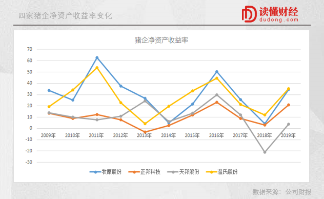 从牧原股份、温氏股份(SZ:300498)、正邦科技(SZ:002157)和天邦股份(SZ:002124)这4家公司,近十年的净资产收益率来看,猪周期的影响十分显著。
