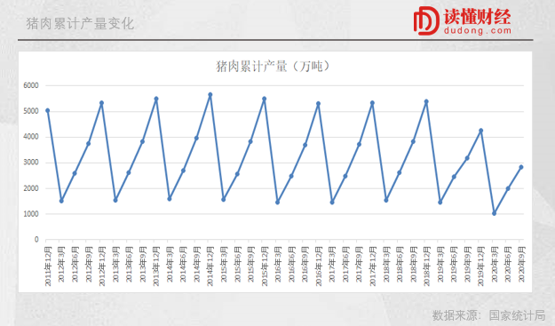 但这一次,由于之前养殖环保法的实施及非洲猪瘟,2019年8月底,能繁母猪存栏量仅有2079.62万头,不到11-14周期的一半;生猪存栏量也仅有3亿头,是11-14周期的2/3。2019年猪肉产量仅有4255万吨,同比减少了1000万吨左右,降幅接近20%。