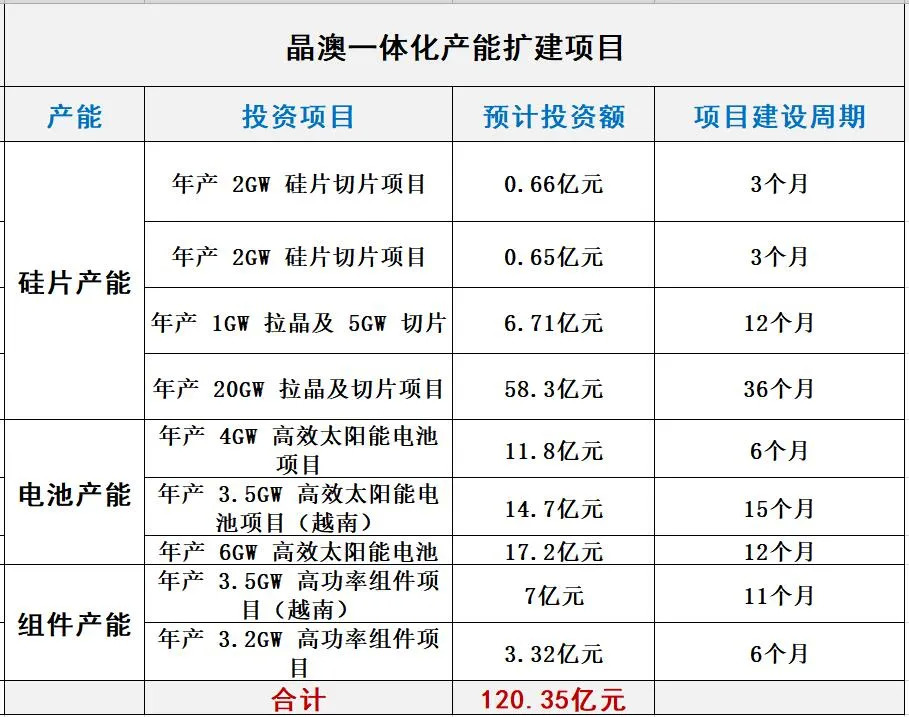 8月17日、9月15日,晶澳科技先后发布两份投建一体化产能公告,涵盖硅片、电池片、组件三大业务领域,总产能50.2GW,总投资预算120.35亿元。