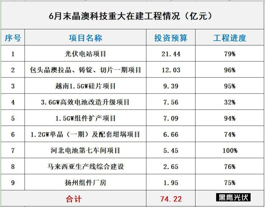 另,黑鹰光伏统计发现:截止2020年6月末,晶澳科技有9大在建工程,总投资预算74.22亿元,多数项目施工进度在70%以上。
