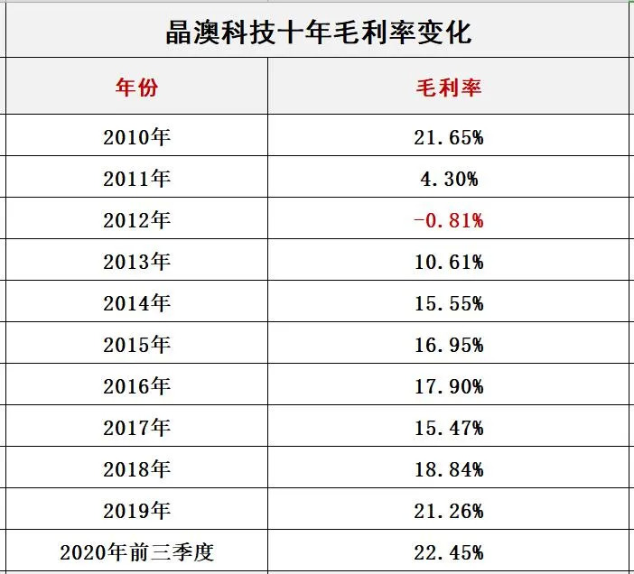 下表是晶澳科技产品毛利率变化,2020年前三季度毛利率为22.45%,较2019年增长1.19个百分点。