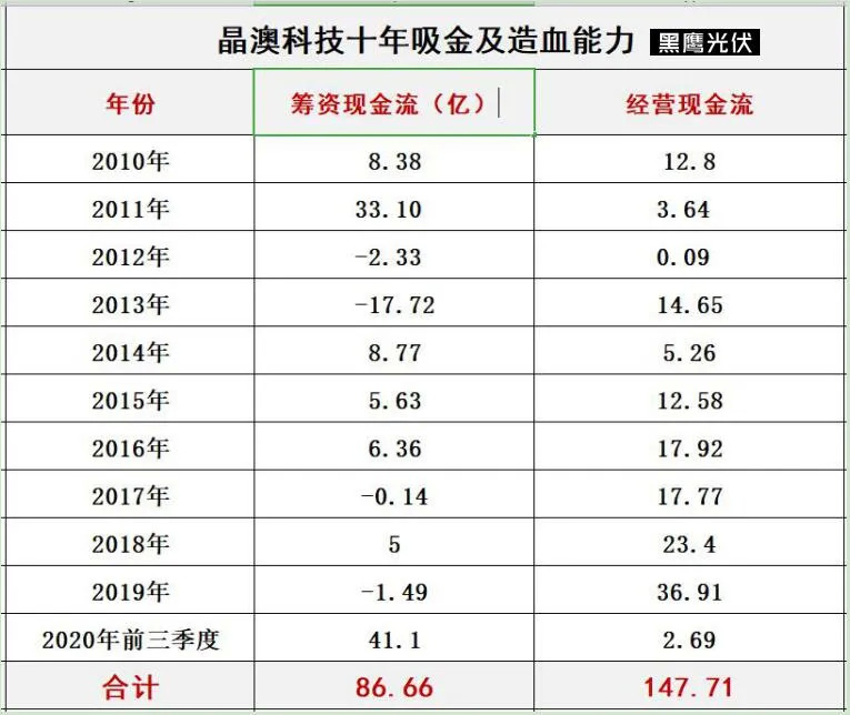 笔者统计数据发现,晶澳科技的长期造血能力要胜于很多竞争对手,比如据黑鹰光伏统计,晶澳科技经营现金流净额已连续11年(2009-2019年)为正,也就是资金一直保持净流入,这在光伏企业中确实极为罕见。