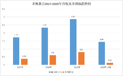 财报显示,2017 年~2019 年老鹰教育分别实现收入 1.73 亿元、2.34亿元和 2.87 亿元,在美术艺考培训行业的市场占有率为1.1%。