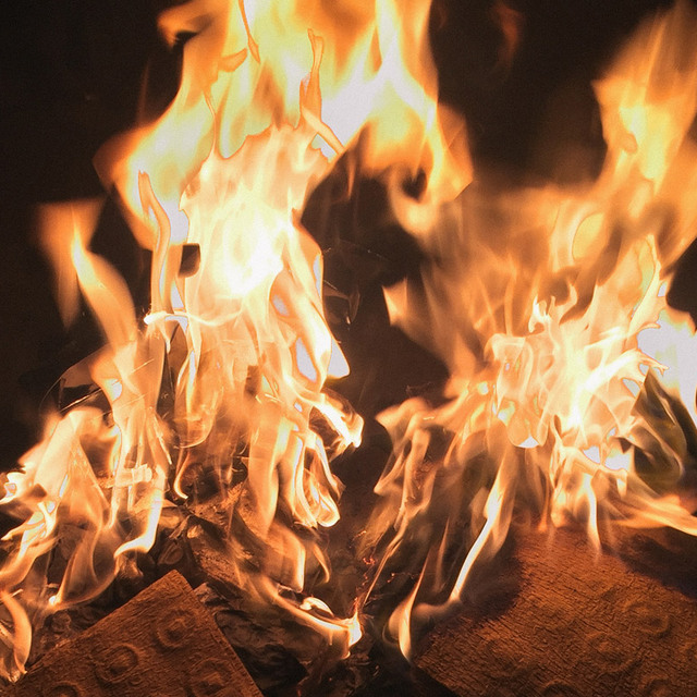 我们在河岸边人行道上划了两个圈。打火机点着印子,先烧表文,给纸钱开道,再烧几张纸给小鬼,算是给它们的买路钱,再给自己的亲人烧。一次加太多纸容易压低火焰,就分成小叠,在火焰边缘点燃,慢慢烧。快燃尽了,就用长木条挑一挑,让火大起来。我们反复说,给你们送钱来了,要过年了,该买什么就买什么,钱不够花就告诉我们,托梦给我们,给你们送钱来了。如同念诵经文。