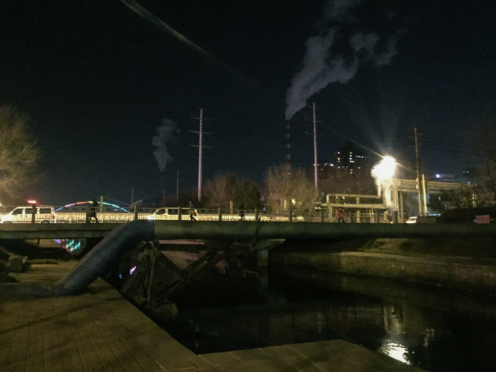 横穿河面的蓝色管道是废水渠的标识,除此之外,完全看不出这条瘦瘦的小河曾是臭水沟。天不太冷,河水没有结冰,周围绿化很好,河边铺了规整人行道,连绵几公里是七彩的夜灯,隔几百米就有一道高高窄窄的彩虹灯桥跨河而立。