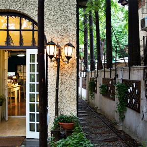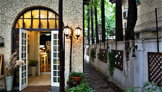 客人先要走进市中心的一条小马路——华亭路,一路数着门牌找到 71 弄,随后经过一家幼儿园才会看到标着 5 号的黑色大铁门。可一旦你踏进铁门,就会发觉之前的一番寻觅微不足道。出现在你右手边的是一栋两层楼的西班牙式老洋房,红色瓦片配着黄色拉毛水泥墙,正前方的碎石地上铺着一道铁轨通往店铺正门。