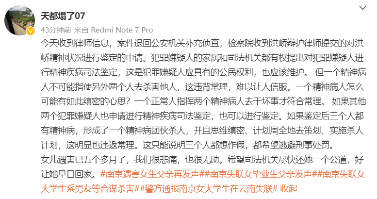 12月12日,南京遇害女大学生李倩月父亲李胜通过微博账号“天都塌了07”发文称,李倩月遇害一案由西双版纳州检察院退回公安机关补充侦查,检察院收到洪峤辩护律师提交的对洪峤精神状况进行鉴定的申请。