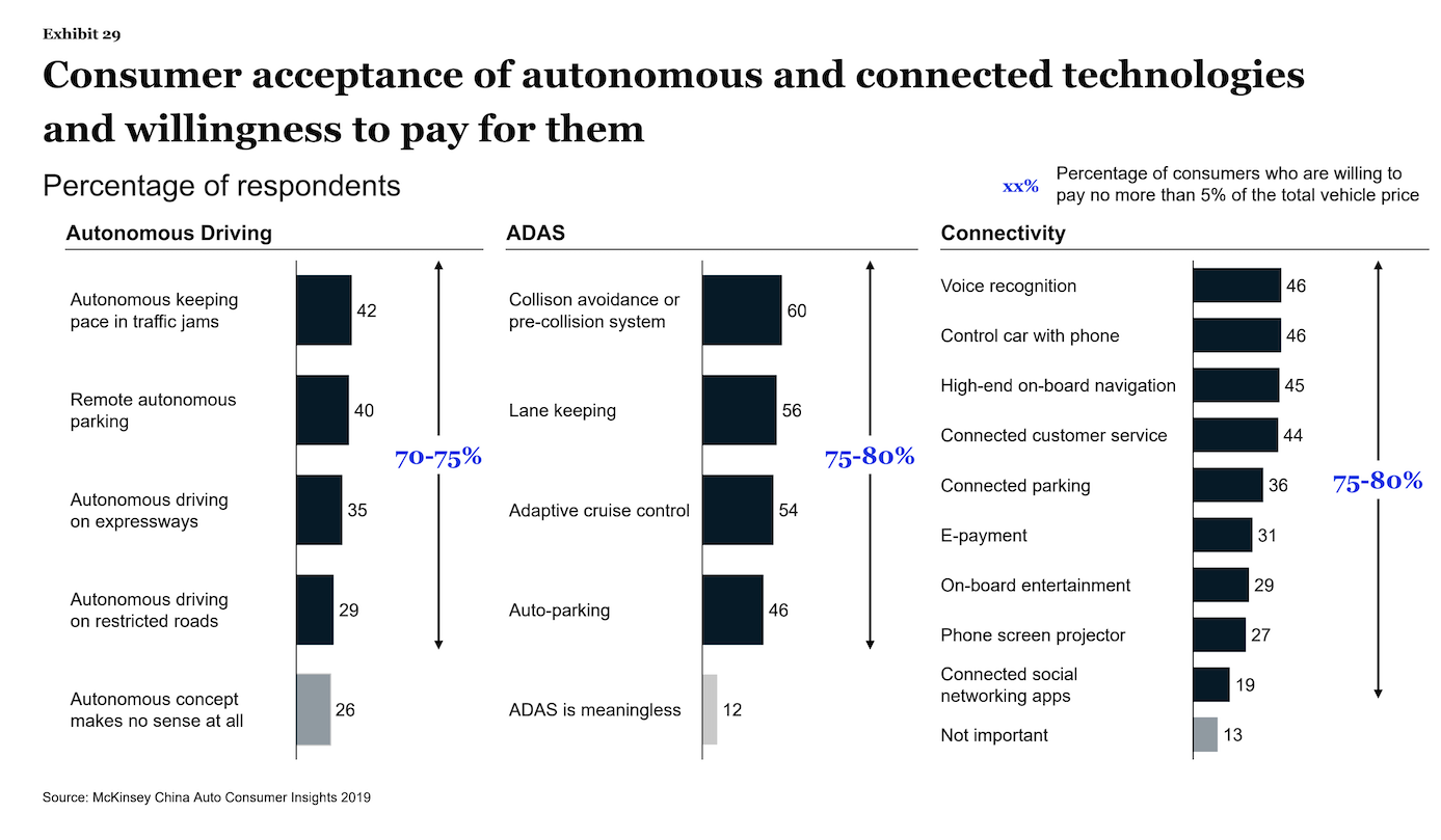麦肯锡在《中国汽车市场消费者洞察报告2019》里将中国购车者称为“超级数字消费者”,这些受访者认为L3级或以上的技术,才有购买价值。