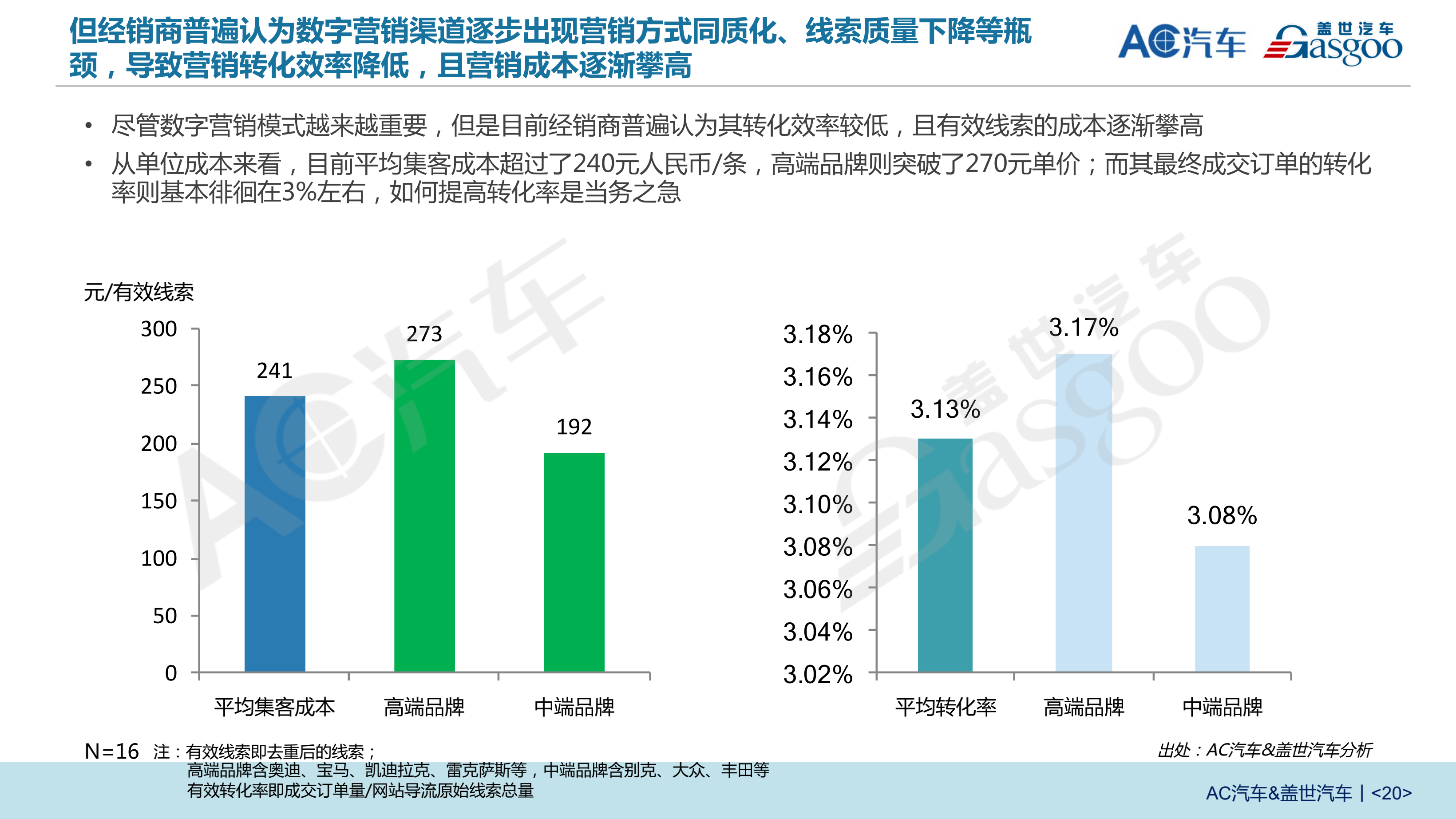AC汽车研究院出品的《2019汽车经销商运营现状白皮书》中提到,目前数字营销渠道的平均集客成本超过240元人民币/条,高端品牌超过270元人民币/条,但最终成交订单的转化率只有3%左右。