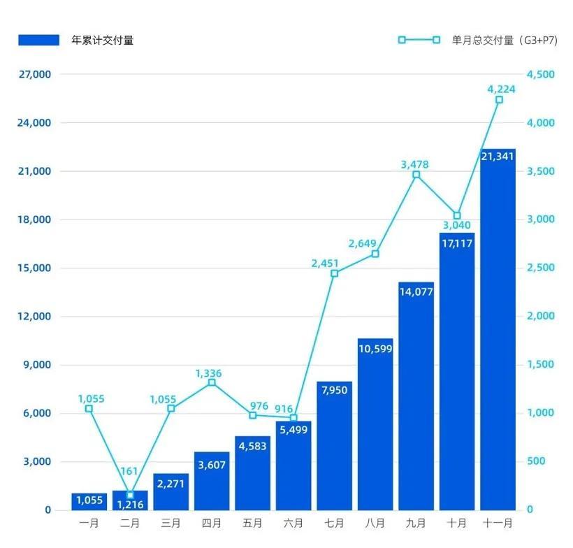 今年11月,小鹏实现交付4224辆,同比增长342%,创今年月度销量新高;1-11月,累计交付新车21341辆,同比增长87%。