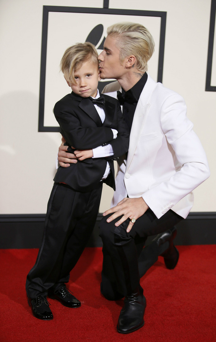 2. 贾斯汀·比伯在红毯上亲吻弟弟。