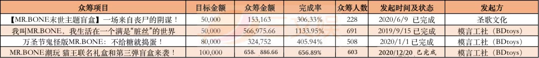 除了广告变现,MR.BONE在潮玩领域也有不错的销售案例。在摩点众筹,2019年“我叫MR.BONE,我生活在一个满是‘脏丝’的世界”项目以1133.9%的完成率完成众筹,金额高达56.7万元。