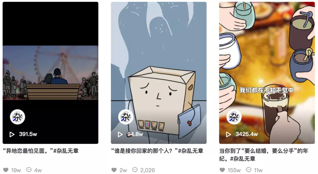 "杂乱无章"以当代年轻人的生活为主题制作的动画短片深受观众喜爱。该账号最近发布15的视频中,《当你到了“要么结婚,要么分手”的年纪。》等三个视频播放量超过3300万。