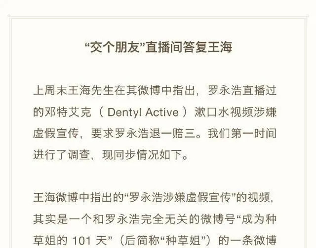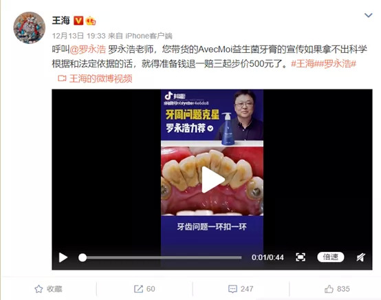 12月13日开始,王海连续在微博发文,对罗永浩直播间带货的“邓特艾克(Dentyl Active)”品牌漱口水,“效果用洗牙视频表现,涉嫌虚假宣传,要求退一赔三起步价500元。”