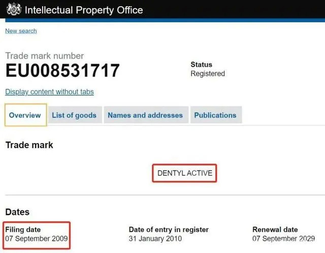 对于商标,英国知识产权局官网显示,“DENTYL ACTIVE”商标早在2009年12月就被提交申请,2010年1月注册,商标所有人是VentureLife Group Plc。
