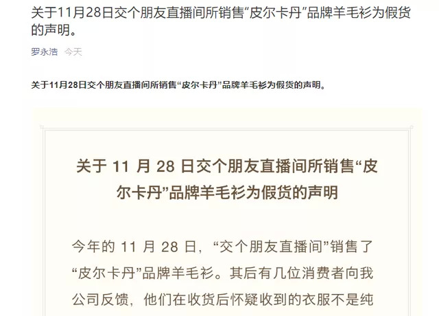 从最新情况来看,王海似乎已占据了更多上风。12月15日,罗永浩通过个人微博转发、公众号等渠道发布声明,承认其11月28日在“交个朋友直播间”销售的“皮尔卡丹”品牌羊毛衫,部分送检后鉴定为非羊毛制品。
