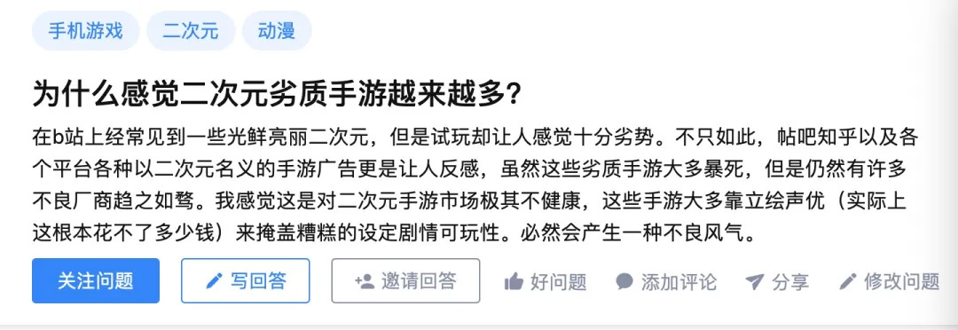 首先,二次元游戏赛道在不断发展的同时,乱象也开始出现。B站游戏中心的开放虽然使用户有了更多游戏选择,但同时也使游戏区进入了大量劣质手游,让许多玩家不适。