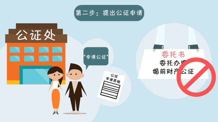 准备好上述材料后,双方必须亲自到公证处提出公证申请,填写公证的申请表格。委托他人代理或是一个人来办婚前财产公证,一般情况下是不会被受理的。