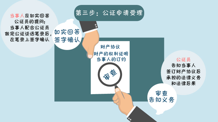 公证申请被接待公证员受理后,公证员审查财产协议的内容、审查财产的权利证明、查问当事人的订约是否受到欺骗或误导,当事人应如实回答公证员的提问,公证员会履行必要的法律告知义务,告诉当事人签订财产协议后承担的法律义务和法律后果。当事人配合公证员做完公证谈话笔录后,在笔录上签字确认。