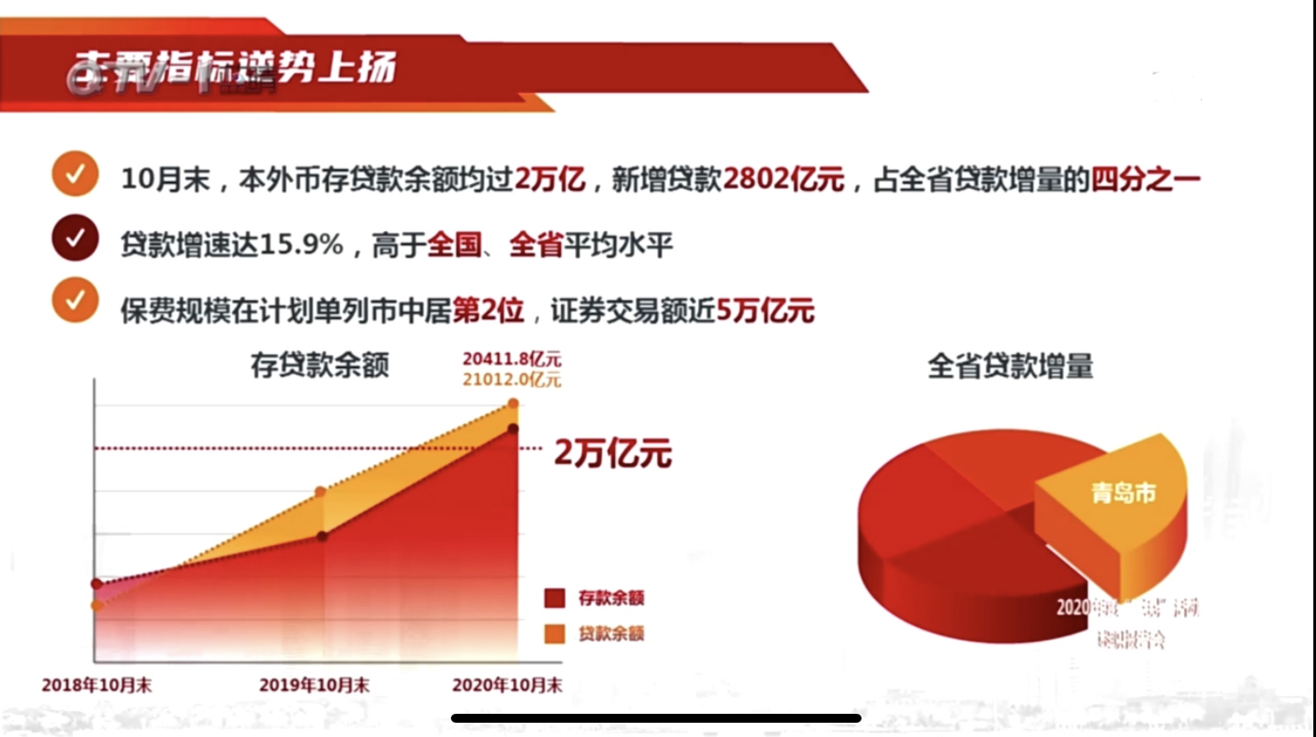 前三季度,全市金融业增加值627.8亿元,同比增长8.5%,增速居国民经济十大行业之首;金融业增加值占全市GDP的比重达到7.2%,比去年同期提高0.4个百分点。10月末,本外币存贷款分别超过2万亿和2.1万亿,增量达到2536亿和2802亿,均为去年全年增量的1.4倍;实现保费收入442亿,在计划单列市中居第2位;证券交易额达到49293.9亿,同比增长51.1%,占全省证券交易额的30%。青岛银行入选中国服务500强企业,青岛农商银行入选全省“十强”产业领军企业。