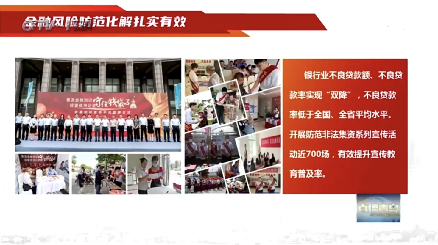 推动企业债务风险化解。采取“一企一策”帮助重点风险企业化解金融风险,银行业不良贷款实现“双降”,不良贷款率低于全国、全省平均水平,处于历史低位。推进金融风险专项整治,权益类交易场所三年清理整顿进入收尾阶段。