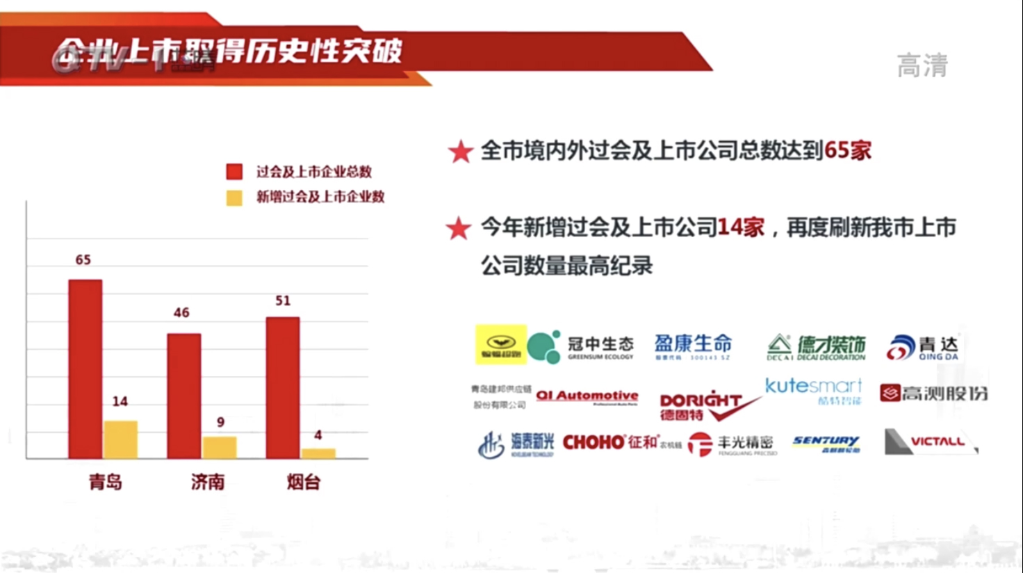 青岛上市公司量质齐升,全市过会及上市公司总数达到65家,居全省首位。年内新增过会及上市公司14家,再度刷新我市上市公司数量最高纪录。威奥轨道、酷特智能、高测股份、森麒麟4家公司首发上市,建邦供应链成为全省首家通过新三板精选层审核的企业。上市后备资源充足,7家企业在中国证监会及交易所待审,17家企业在青岛证监局辅导,16家企业入选全省首批科创板上市培育库。开展“万名企业家资本市场培训”专项行动,举办公益培训近百场,参训过万人。组织“青岛企业家上海资本市场行”,服务企业精准对接资本市场。与上海证券交易所合作设立科创板拟上市企业评价增信指数体系,提升科创板上市审核效率,推动更多企业通过科创板上市。