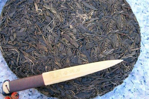 茶刀,一般是木、竹、象牙、牛角、牛骨、金、银铜、铁、等材料制成,结构包括带有刀柄的刀体及刀鞘。利用刀体前端的尖刃可顺利的插入茶饼内切割,以此沿被切轨迹重复上述方法,轻加很小外力,即可实现茶饼部分的分离。