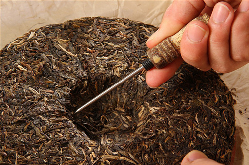 可是,撬茶总不能用手掰,得有工具呀。啊,对了,茶筒里插着一根针一样的东西,刚好是尖的,很适合,拿过来一戳,一撬,茶被撬开了,完美!