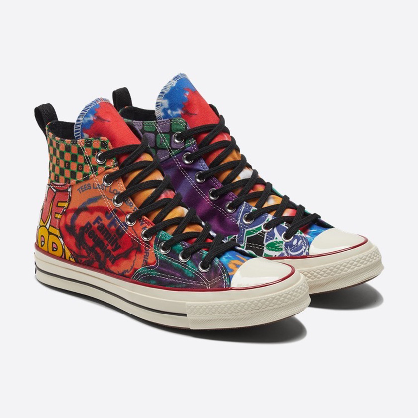 CONVERSE X Joe Freshgoods CHUCK 70将多种色彩绚丽的T恤图案进行组合拼接,鞋舌处图案带有扎染风格,鞋侧同样采用了T恤标设计。