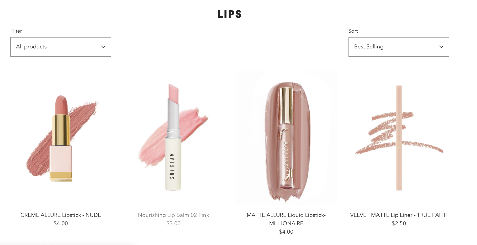延续了SHEIN一贯主打上新快、品质优、价格低的策略特性,SHEGLAM声称“魅力并不只是为那些买得起它的人准备的”,并表明产品均采用了一线美妆品牌所用级别的原料,同时剔除了中间商,运输将于服装订单捆绑在一起, 削减了营销费用。这些将大大减少产品成本,同时降低了提供消费者的价格。