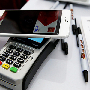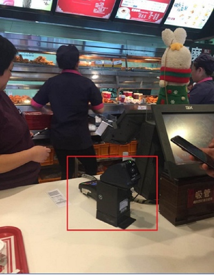 Apple Pay由于可以绑定他人的银行卡,因此在支付环节添加了银行卡密码验证。用户在支付的时候,需要自己将苹果手机贴近商家提供的支付设备,下图中的红框。