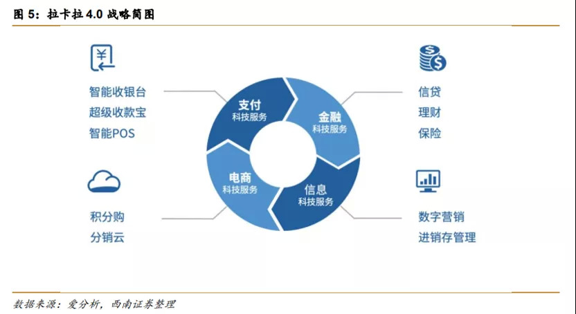 2019年下半年,拉卡拉发布了4.0战略,开始由超越支付向综合性企业服务公司升级。具体为,公司将通过支付科技服务(贷、理财和保险)、电商科技服务(积分购、分销云)、信息科技服务(数字管理、进销存管理)等发力产业互联网,全维度为中小微企业的经营赋能。