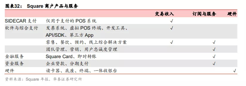 Square自2009年成立以来,由支付业务出发,结合复杂的软件和经济实惠的硬件,迅速占领了中小微企业,并积极布局B端和各类增值服务,如订阅服务,企业贷款、分期支付、即时转账等,致力于打造一个有凝聚力的商业生态系统。相比而言,拉卡拉在商业模式、服务对象、公司属性方面与Square有着高度相似。