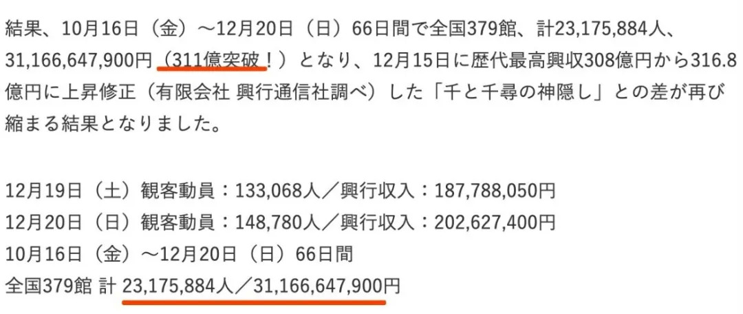 上映66天,票房超311亿日元,刷新《千与千寻》保持的308亿日元记录,观影人数也突破了2317.5万人次。