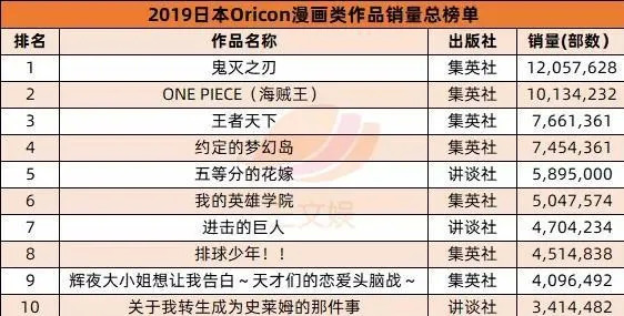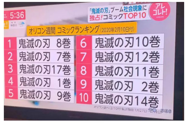 TV动画的热播带动了漫画的销量,2019年原著漫画以1205万部的销量打破了《航海王》在Oricon榜13年连霸纪录,成功登顶。