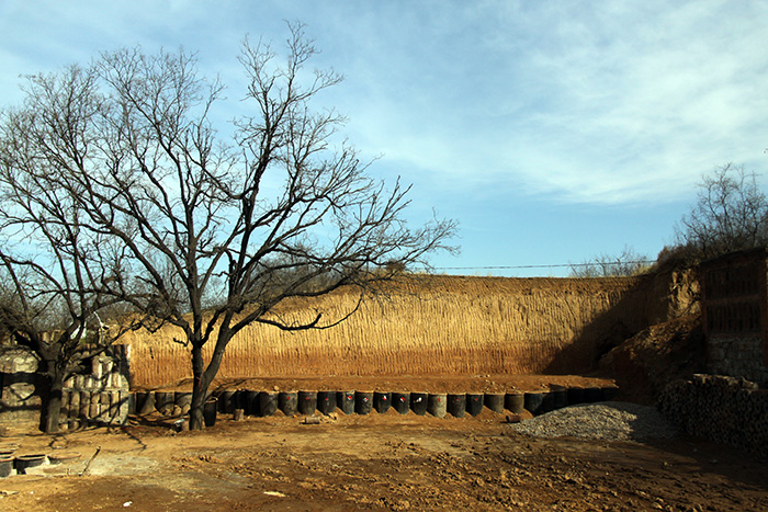 再次来到张家楼老村,刚到村口,便看到了一个大戏台。仔细一看,戏台下面还摆了一排黑肚黄口的大缸。询问后得知,戏台是去年下半年搭的,因了村口的地势,靠墙打造而成。台下那一排大缸是村子的“特产”,既可以作为支撑,也成了一种造型。这是张家楼老村被完整保护下来后,进行艺术装饰的一个小部分。