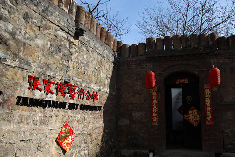戏台旁边立了一个牌坊。圆木、茅草做顶,也被两排大缸撑起来。牌坊四角殷红的灯笼簇拥着门楣上的匾额,匾额上写着几个苍劲有力的字:张家楼艺术公社。这便是张家楼老村保护的总部。