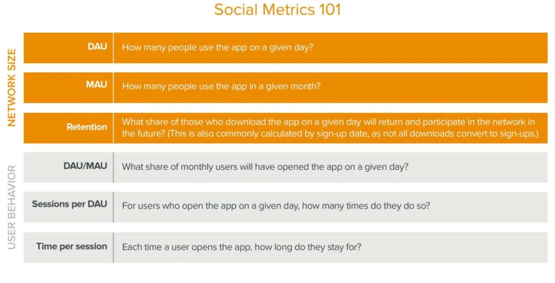 当一款社交应用跑起来后,人们关注的指标往往很清晰:每天、每周或每月有多少人在使用它,它的增长趋势如何?但评估一款社交应用的潜力却并不简单,到底该怎么定义一款社交应用是否有潜力?不同类别的社交应用在参与度、粘性和留存率方面如何组合(以及哪些KPI是最重要的观察指标)?后起之秀能否与叱咤风云的社交巨头竞争?