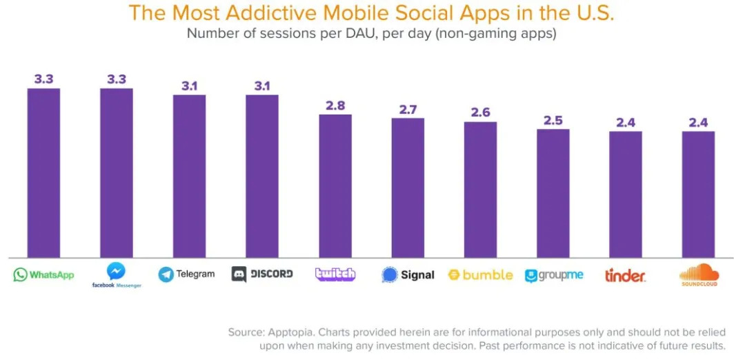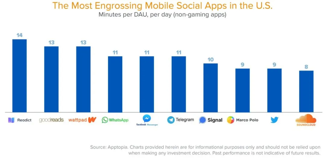 平均而言,用户使用约会应用的频率相对较高,每天2.5次,但每次打开可能只持续一到两分钟。相比之下,像Goodreads、Wattpad和Readict这样的垂直阅读和写作社区的打开频率较低,每天1到2次,但每次打开平均超过13分钟。尽管频率相对较低,但这些用户仍然在应用中花费了相当多的时间,这表明他们从这个社交网络中获取了有意义的价值。