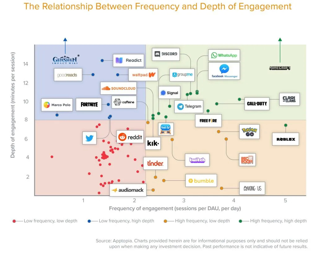 在这种情况下,我们认为每个用户所花费的总时间是用户从各个应用的网络中获取价值的代指;注意力捕获指标是对 "这值得我花时间吗?"这个古老问题的回答。当然,从商业的角度来看,并不是所有花在应用上的时间都具有同样的价值。