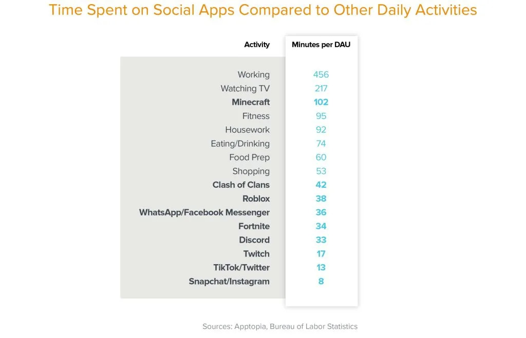 当然,有些社交应用既能“让人上瘾(频率)”,又能“令人沉迷(每次使用的时长)”。在所有顶级社交应用中,社交游戏和消息应用的访问频率最高,每次访问的时间也最长。通过比较,看看几款顶级社交应用与其他日常活动在每DAU分钟数(参与某项活动的用户,每天花多少分钟进行该活动)方面的比较。